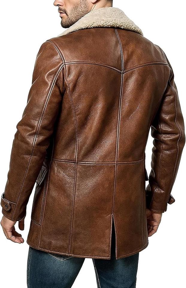เสื้อโค้ทยาวหนังแท้บุขนแกะสีน้ำตาลวินเทจสำหรับผู้ชาย