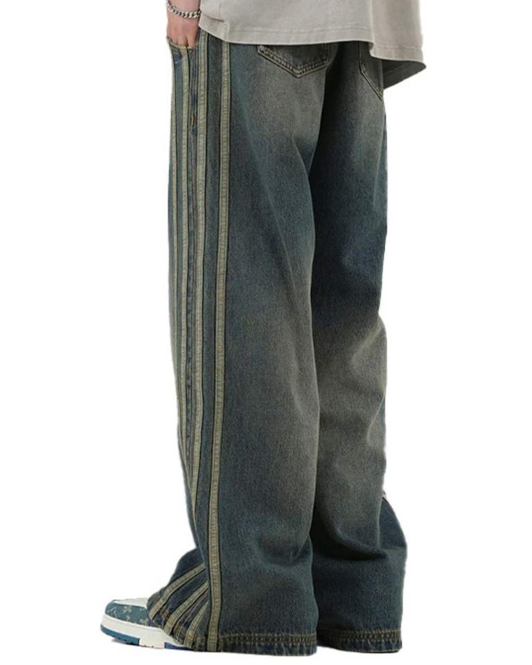 กางเกงยีนส์เดนิมทรงขากว้างสไตล์วินเทจสำหรับผู้ชาย สีเขียวฟอก ลายแถบข้าง ทรงหลวม ทรงตรง สไตล์สตรีทแวร์ลำลอง ขายส่งแบบ OEM