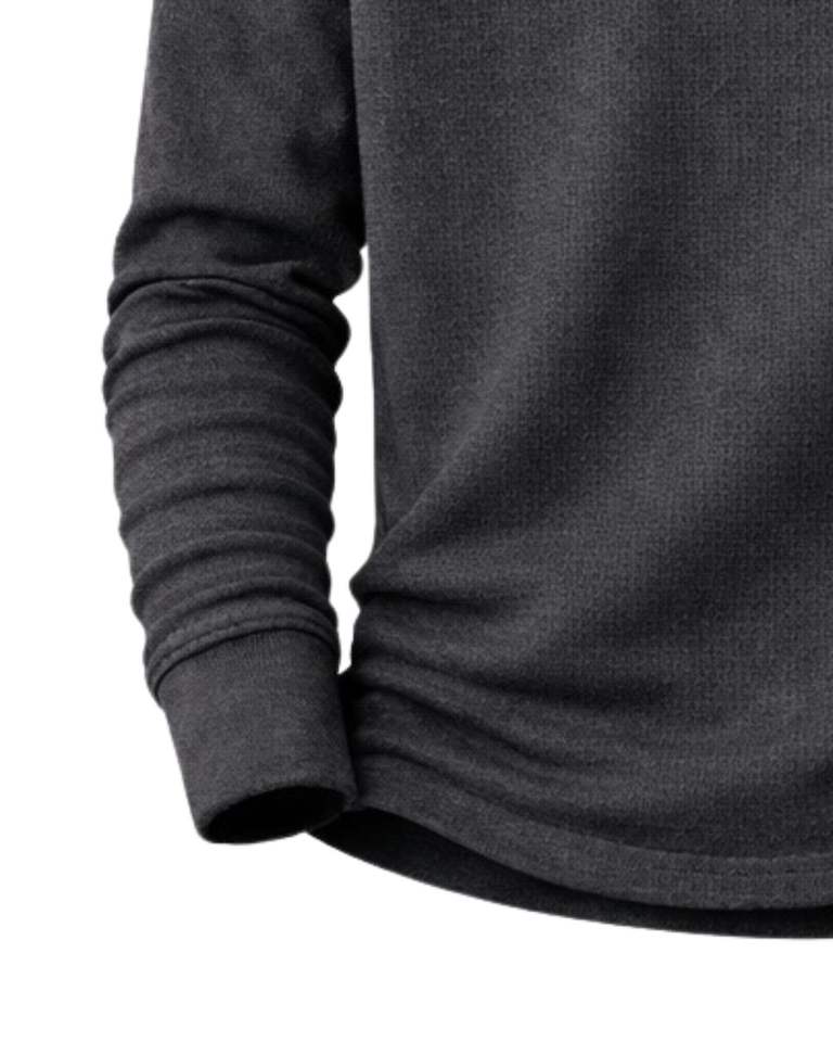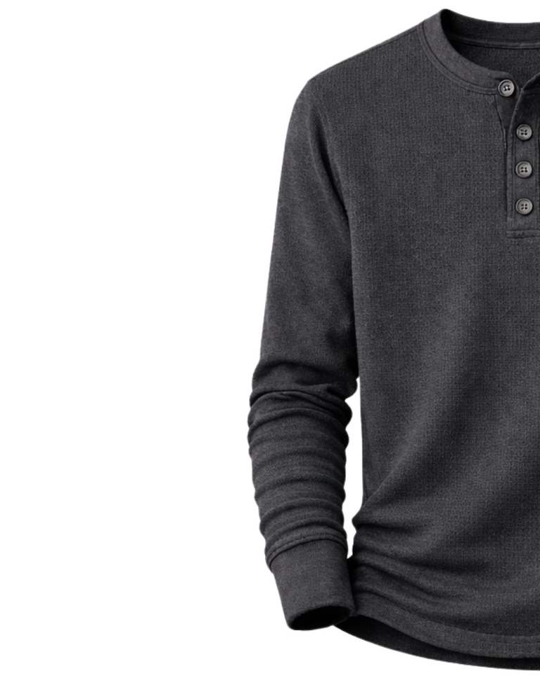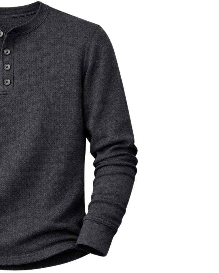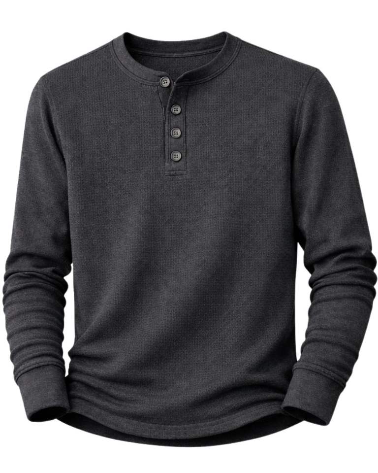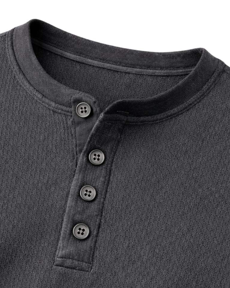 เสื้อยืดแขนยาวผู้ชายแบบเฮนลีย์ ผ้าวาฟเฟิล สีเทาชาร์โคล สวมใส่สบาย คอติดกระดุม เหมาะสำหรับฤดูหนาว ผ้าฝ้ายทรงเข้ารูป ระบายอากาศได้ดี