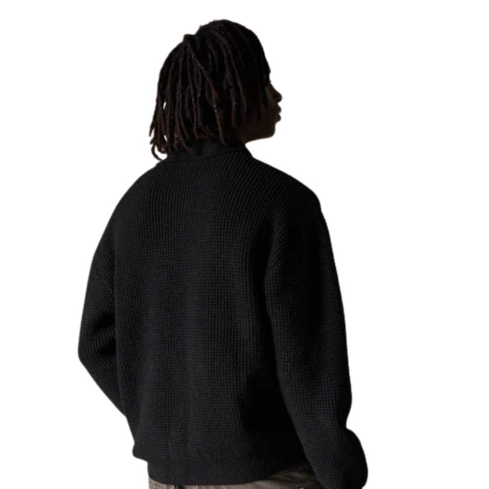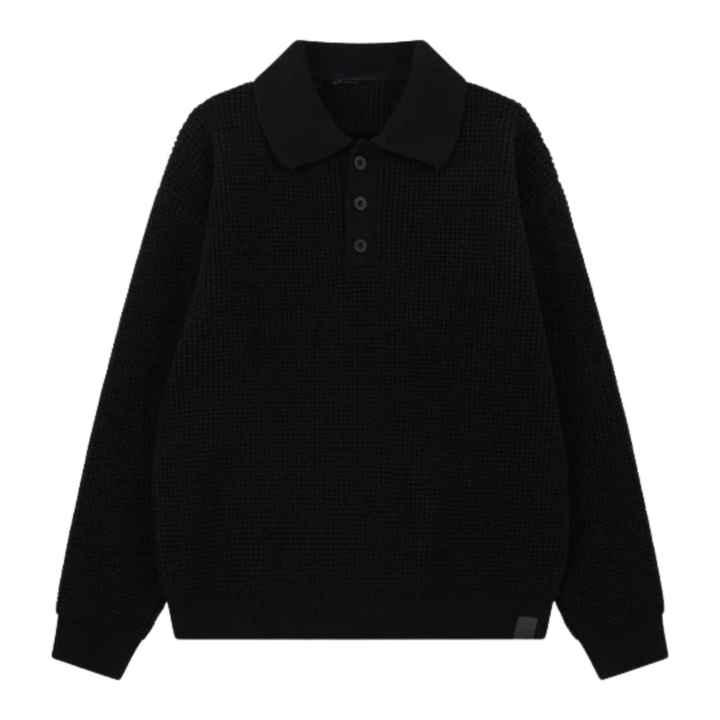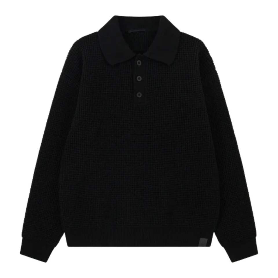 เสื้อโปโลแขนยาวผ้าวาฟเฟิลถักสำหรับผู้ชาย สีดำ สไตล์ลำลอง คอปกติดกระดุม เนื้อผ้านุ่ม ผสมผ้าฝ้าย รับผลิตตามแบบ OEM
