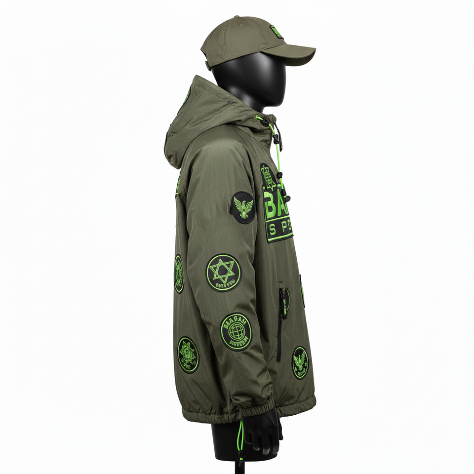 เสื้อแจ็คเก็ตกันลมผู้ชาย ผ้าโพลีเอสเตอร์ความหนาแน่นสูง สีเขียวมะกอก ปักโลโก้ด้วยเทคนิคการถ่ายเทความร้อนแบบกำหนดเอง เสื้อแจ็คเก็ตกันลมสำหรับผู้ชาย