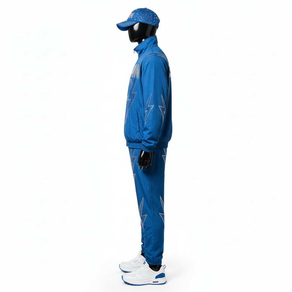 ชุดวินด์เบรกเกอร์ผู้ชาย ผ้าโพลีเอสเตอร์ทอ สีน้ำเงินกรมท่า แผงลายสายฟ้า โลโก้แบบรีดร้อน สั่งทำได้ ไซส์พลัส