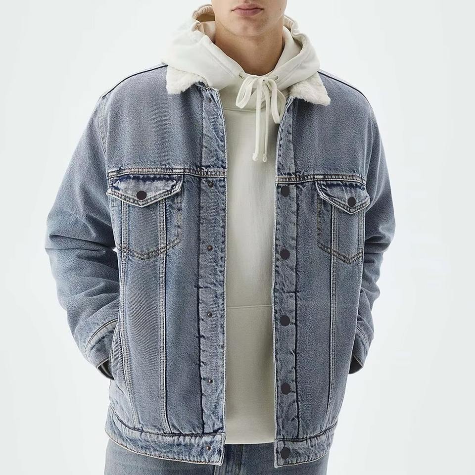 เสื้อแจ็คเก็ตยีนส์ผู้ชายสำหรับฤดูหนาว ผ้าฝ้าย 100% สไตล์วินเทจ แบบสองด้าน ปักลายปะติด ปิดด้วยกระดุม ดีไซน์แขนเสื้อแบบปกติทันสมัย