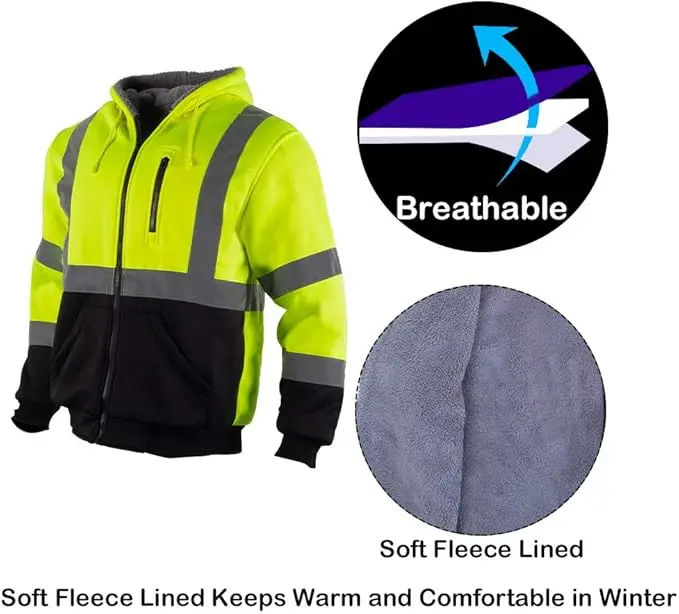 เสื้อแจ็คเก็ตนิรภัยสะท้อนแสง ANSI Class 3 แบบมีฮู้ดซิปสำหรับผู้ชาย ผ้าฟลีซ สีเหลืองดำ สำหรับงานอุตสาหกรรม พร้อมฉนวนกันความร้อน รับผลิตตามแบบ (OEM)