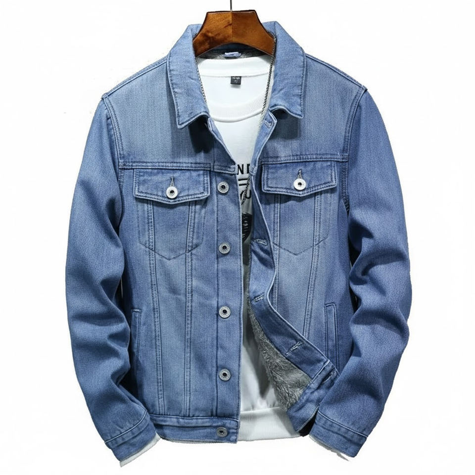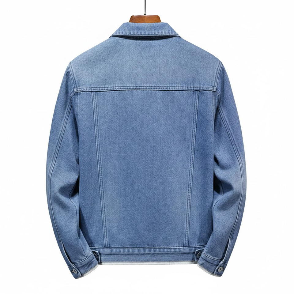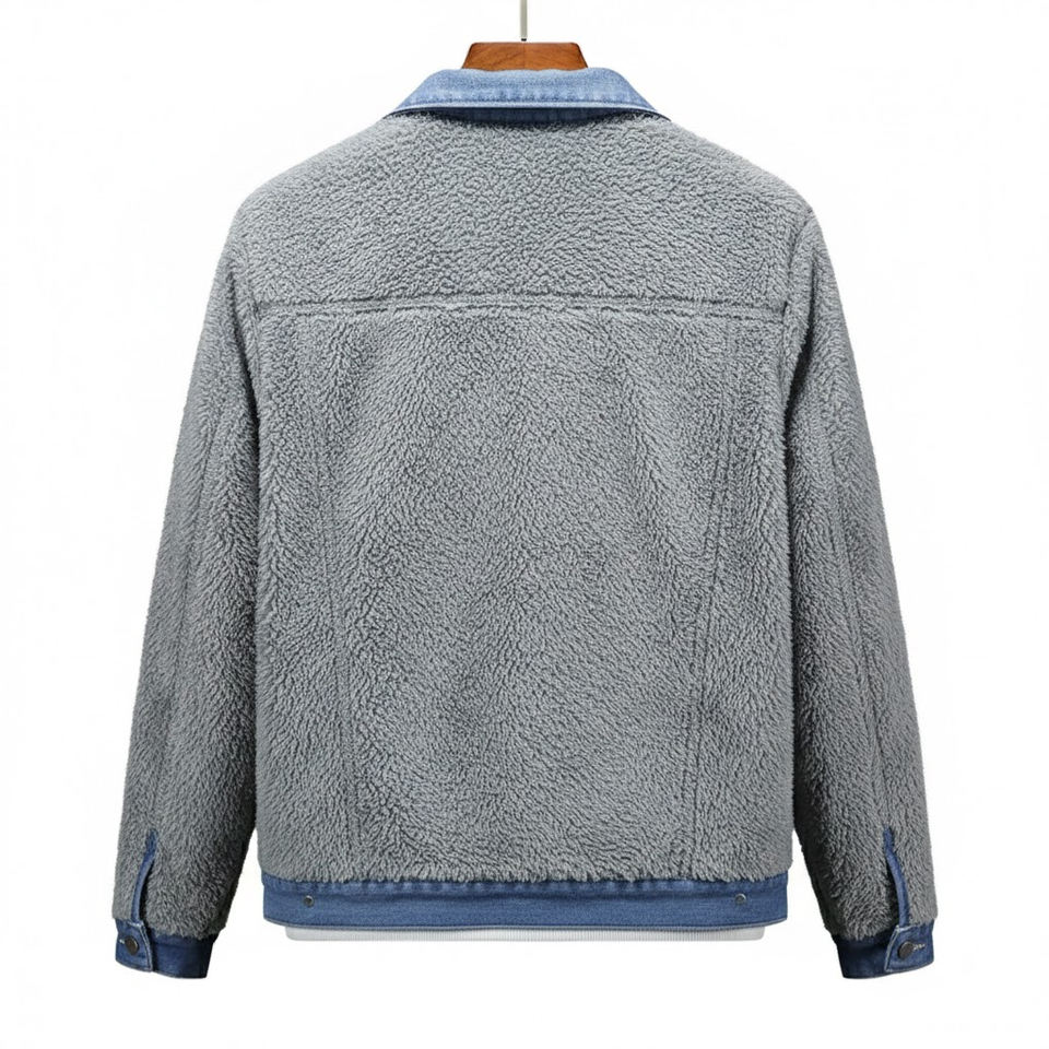 เสื้อแจ็คเก็ตยีนส์ผู้ชายสำหรับฤดูหนาว สีฟ้าอ่อน คอตั้ง มีกระเป๋าหน้า บุขนสัตว์เทียมแบบเป็นมิตรต่อสิ่งแวดล้อม แต่งขอบด้วยขนเฟอร์เทียม เสื้อคลุมกันหนาว