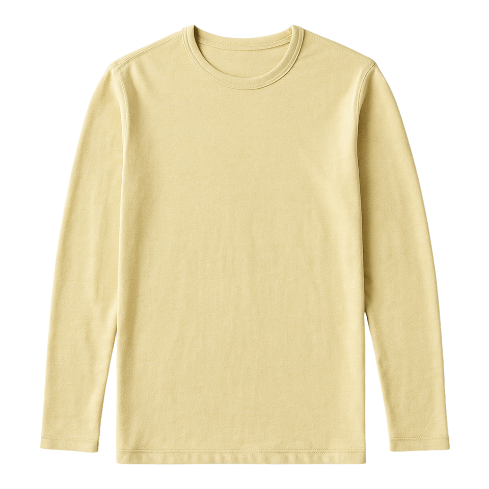 เสื้อยืดคอกลมแขนยาวผู้ชาย สีเหลือง ผ้าฝ้ายออร์แกนิค 100% ระดับพรีเมียม ผ่านการรับรอง GOTS ผ้าไม่หด ระบายอากาศได้ดี