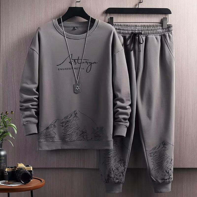 ชุดกีฬาวัยรุ่น2ชิ้นสำหรับผู้ชาย, ชุดเสื้อแขนยาวพิมพ์ลายกางเกงขายาวทนทานสำหรับฤดูใบไม้ผลิฤดูใบไม้ร่วงฤดูร้อนสไตล์อินเทรนด์