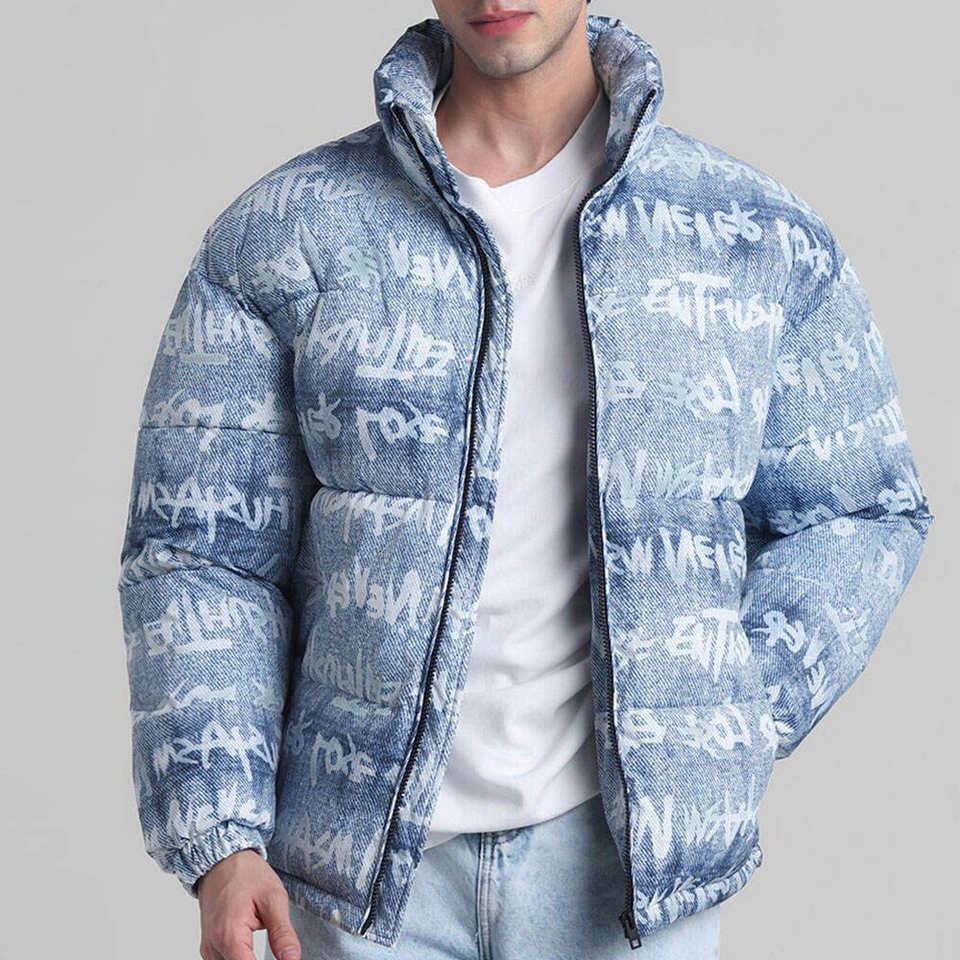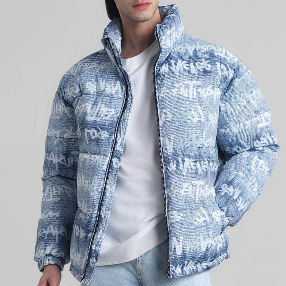 เสื้อแจ็คเก็ตพัฟเฟอร์ไนลอนพิมพ์ลายสำหรับผู้หญิง สีน้ำเงิน อุ่นสบาย บุใยฉนวนกันหนาว ใส่ได้ในฤดูหนาว เป็นมิตรกับสิ่งแวดล้อม น้ำหนักเบา มีซิปด้านหน้า