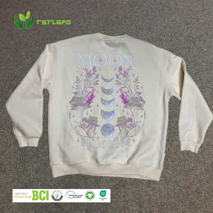 เสื้อสเวตเตอร์ผ้าฝ้ายออร์แกนิกสำหรับผู้ชาย, เสื้อมีฮู้ดโอเวอร์ไซส์ทรงโอเวอร์ไซส์ทรงดวงจันทร์ลึกลับปักลายดอกไม้แขนสั้นคริสตัลฤดูใบไม้ผลิ100%