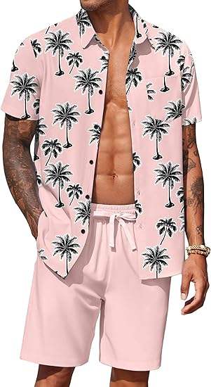 ชุดฮาวาย 2 ชิ้นสำหรับผู้ชาย เสื้อเชิ้ตแขนสั้นติดกระดุมและกางเกงขาสั้น ชุดลำลองชายหาด