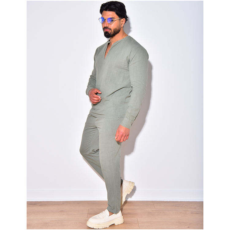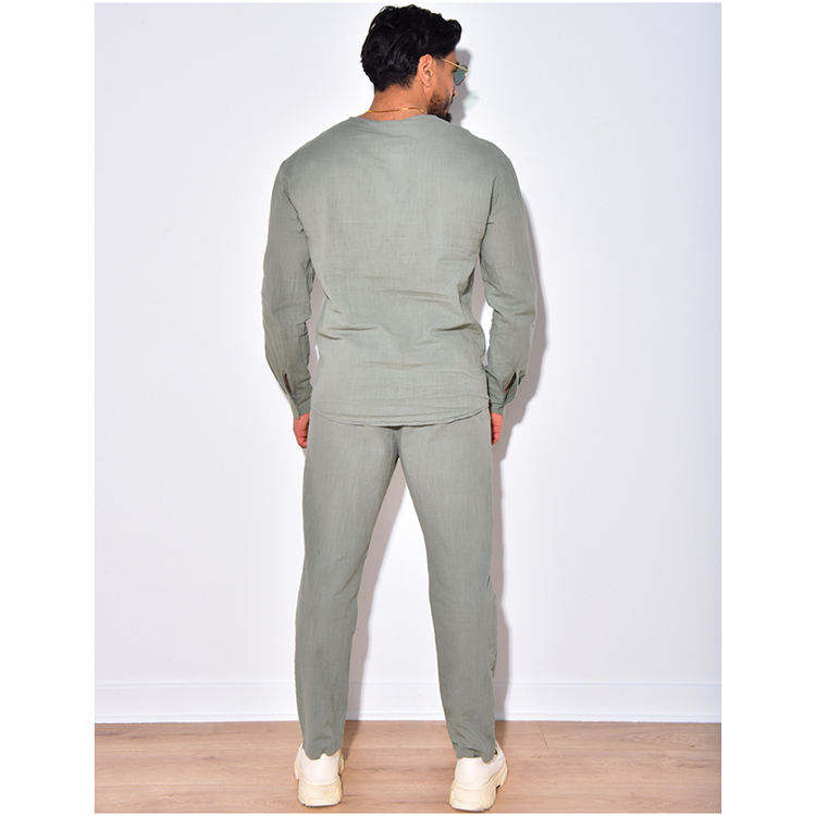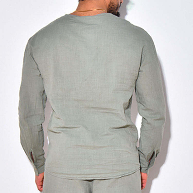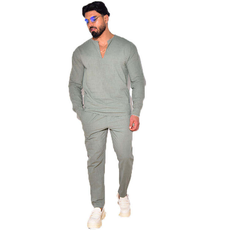 ชุดเสื้อแขนยาวและกางเกงขายาว 2 ชิ้นสำหรับผู้ชาย ระบายอากาศได้ดี สวมใส่สบาย เนื้อผ้าฝ้าย 100% ชุดลำลองสำหรับฤดูร้อนสำหรับผู้ชาย
