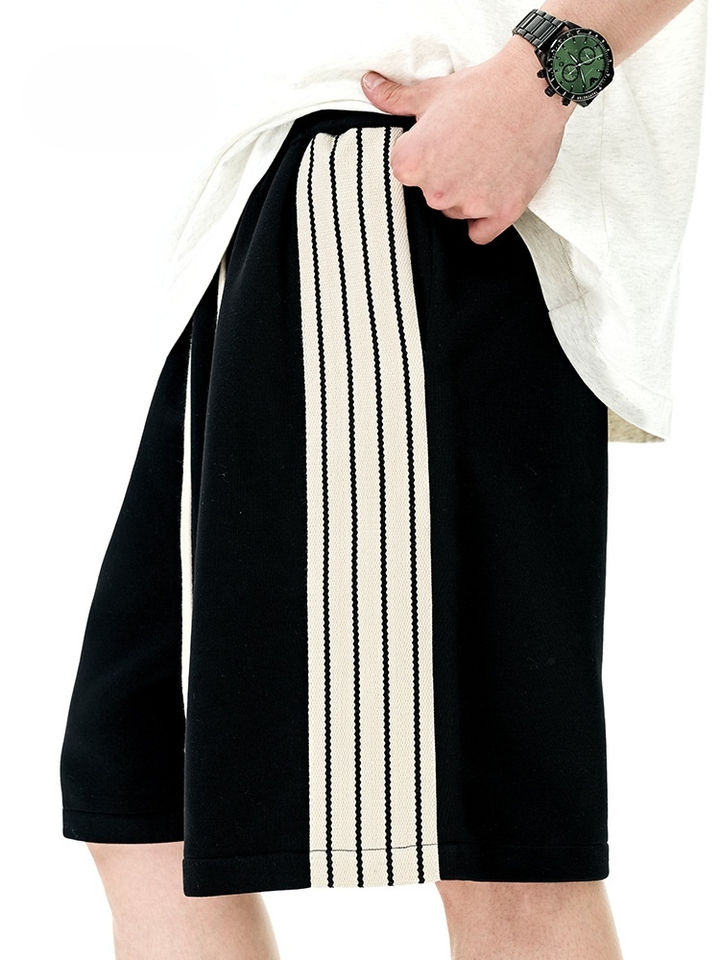 กางเกงขาสั้นผู้ชายแบบลำลองสำหรับฤดูใบไม้ผลิ/ฤดูร้อน2025กางเกงเอวกลางแบบอเมริกันแบบถักกางเกงขาสั้นสีตัดกัน