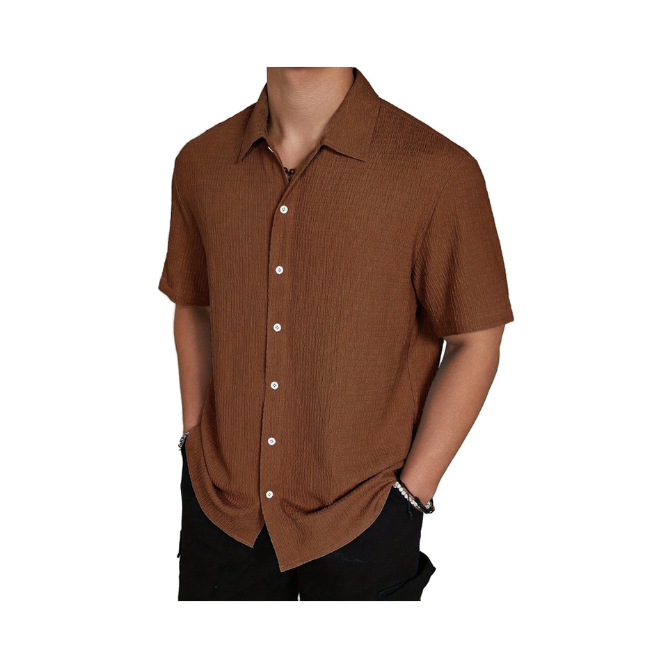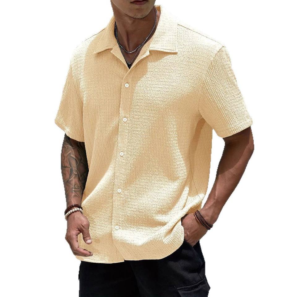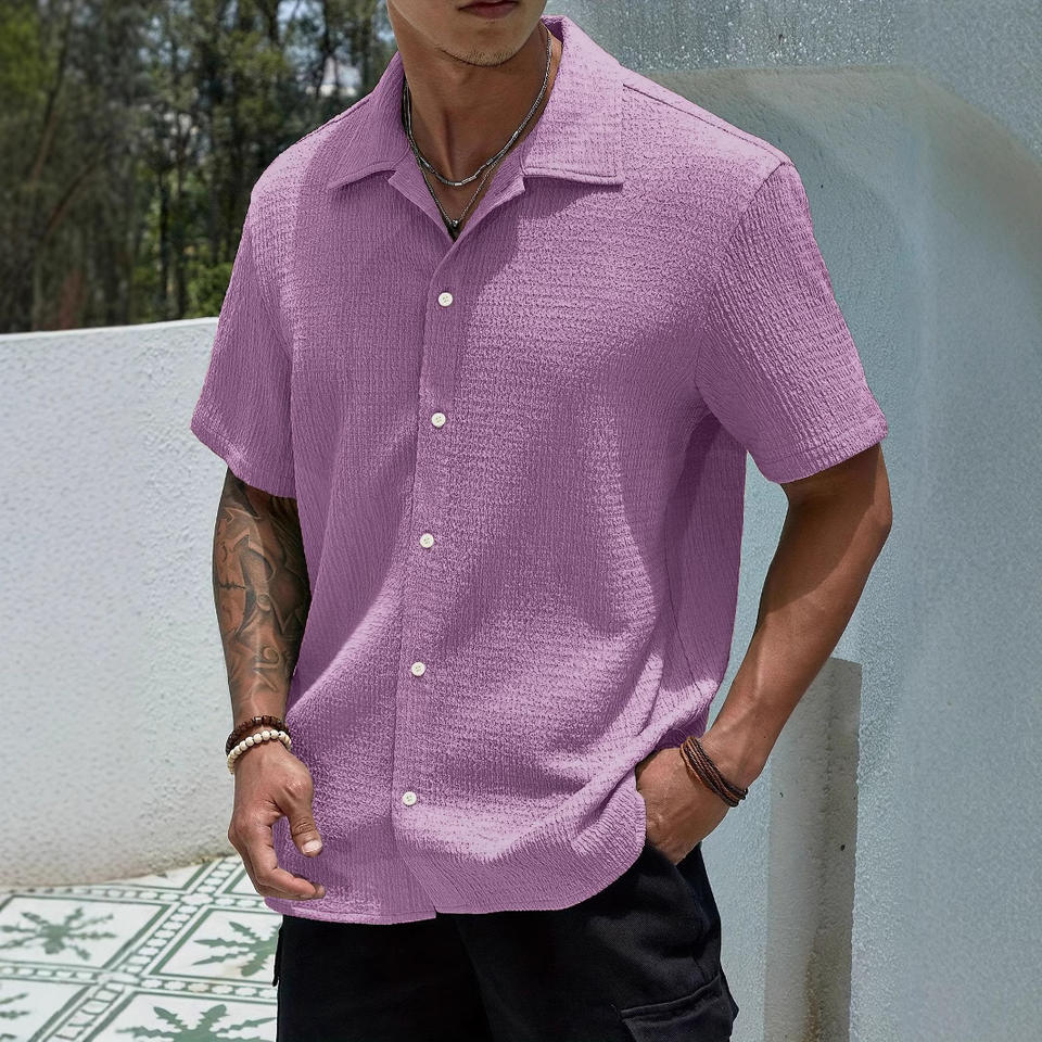 คอลเลกชั่นเสื้อเชิ้ตผ้าคอตตอน100% สำหรับผู้ชายเสื้อเชิ้ตถักติดกระดุมแขนสั้นสีพื้นระบายอากาศได้ดี2025ฤดูร้อน