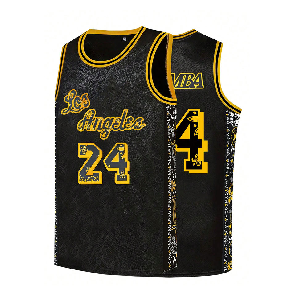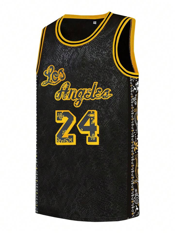 เสื้อกล้ามบาสเก็ตบอล #24ของผู้ชายสีดำเสื้อทรงหลวมแขนกุดสำหรับออกกำลังกายกีฬาฤดูร้อนขนาดพิเศษปักตัวอักษรและจำนวน