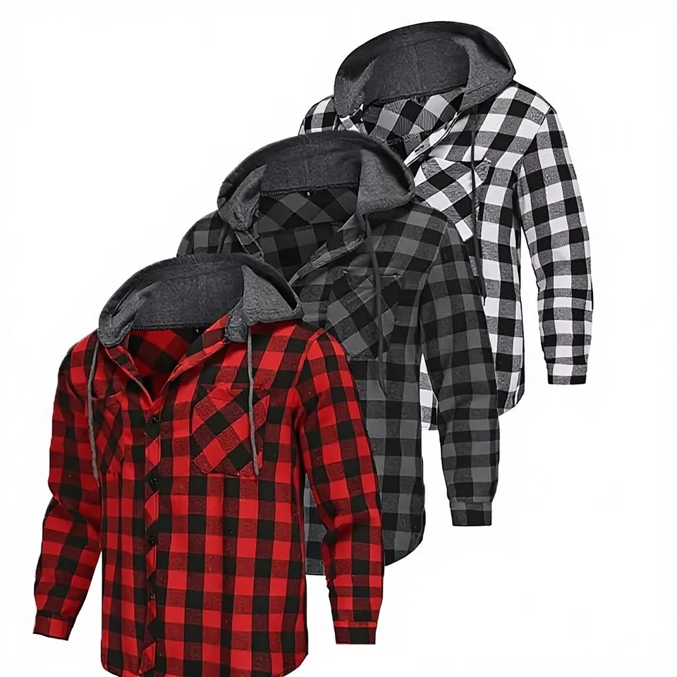 ชุดเสื้อเชิ้ตผู้ชาย 3 ชิ้น ลายทาง มีฮู้ด แขนยาว ติดกระดุม มีกระเป๋า ผ้าฝ้าย 100% ทรงปกติ ผ้าแฟลนเนล