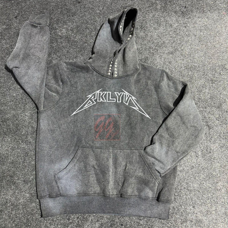 Men's 400GSM Acid Wash Pullover Hoodie with Distressed Embroidery Studs Custom Logo & Sun-Faded Stone Wash Hoodies