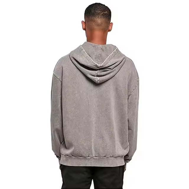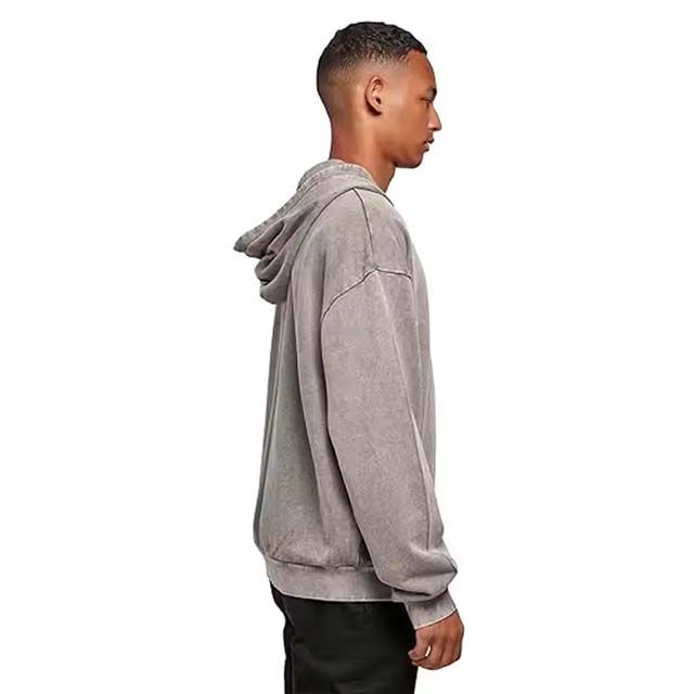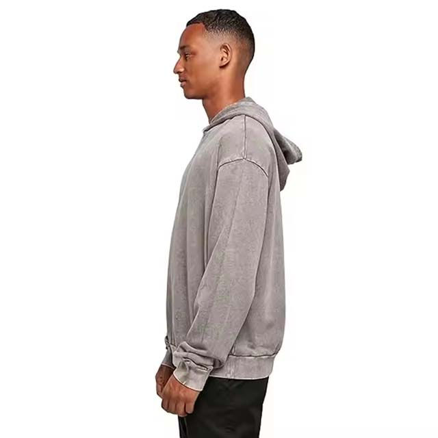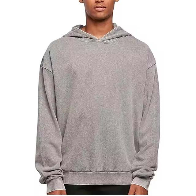 เสื้อฮู้ดดี้ผู้ชายสีเทาฟอกกรด ผ้าฝ้ายฟลีซ 100% สไตล์สตรีทแวร์ ซีดจางแบบซันเฟด เย็บสองชั้น ขาดแบบดีไซน์พิเศษ หนัก 300 กรัม