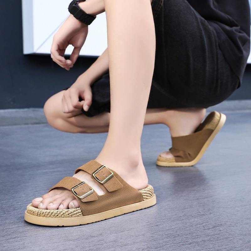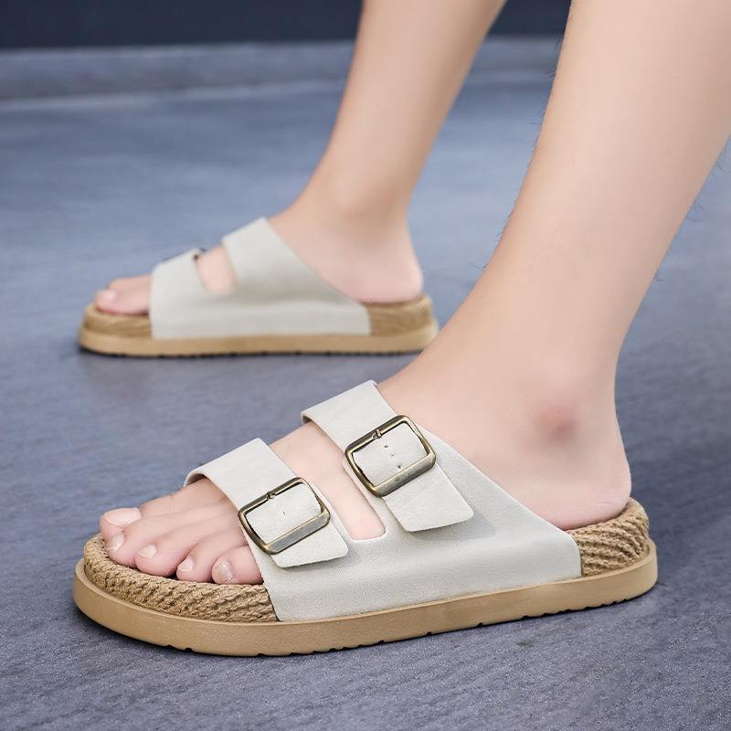 รองเท้าแตะแบบสวมเปิดส้น สีดำ สำหรับทุกเพศทุกวัย ใช้ได้ทุกฤดู มีหัวเข็มขัดคู่ พื้นยาง บุผ้าลินิน ปรับขนาดได้ เหมาะสำหรับใส่ลำลองหรือไปชายหาดทุกวัน