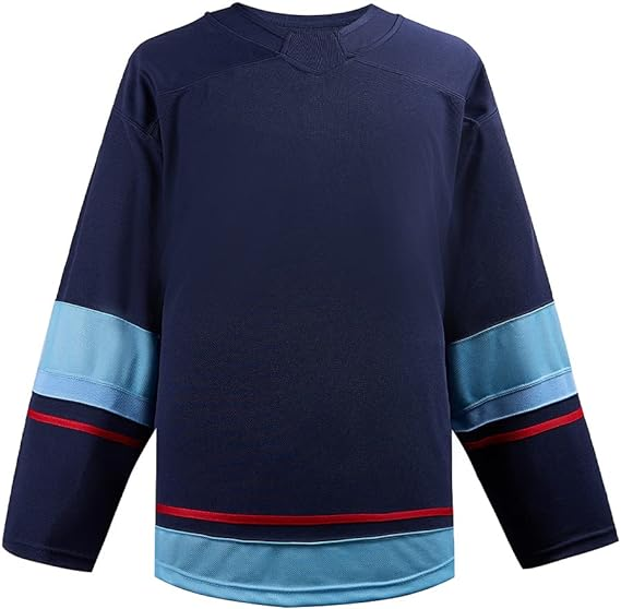 ชุดเสื้อฮอกกี้น้ำแข็งสำหรับผู้ชาย ผ้าโพลีเอสเตอร์ 100% พิมพ์ชื่อทีมตามสั่ง โลโก้ด้านหน้า/ด้านหลัง แห้งเร็ว ระบายอากาศดี บริการ OEM