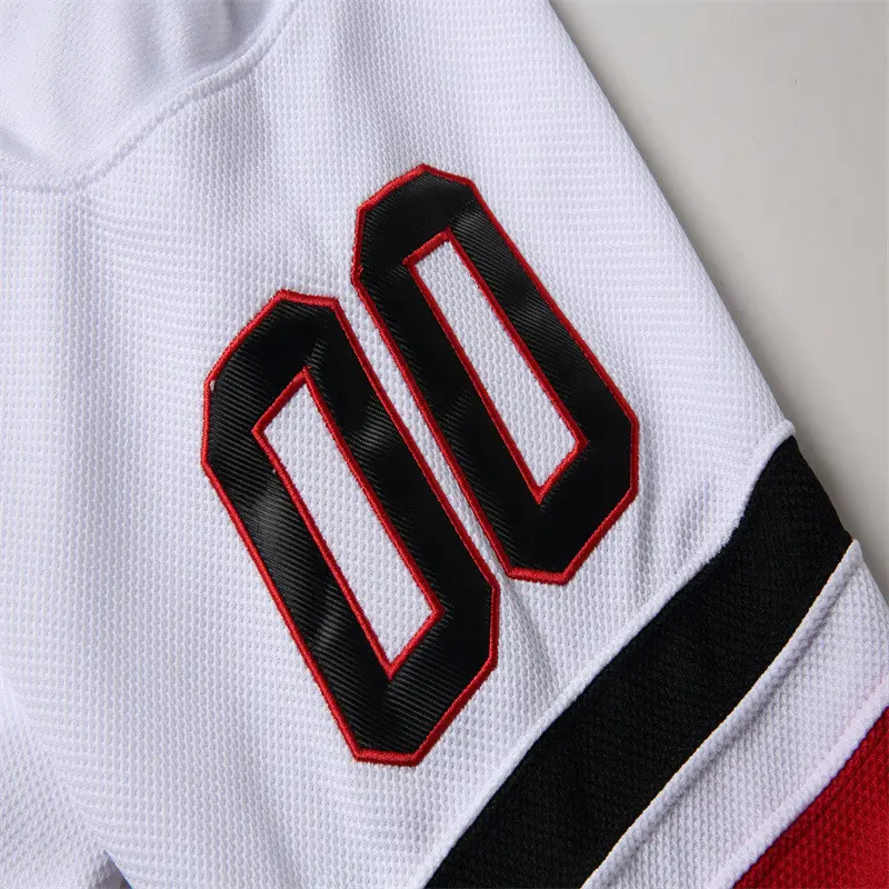 ชุดเสื้อฮอกกี้น้ำแข็งสำหรับผู้ชาย ผ้าโพลีเอสเตอร์ 100% พิมพ์ชื่อทีมตามสั่ง โลโก้ด้านหน้า/ด้านหลัง แห้งเร็ว ระบายอากาศได้ดี บริการ OEM