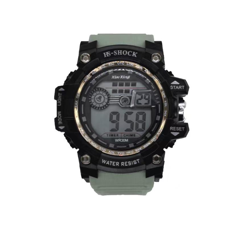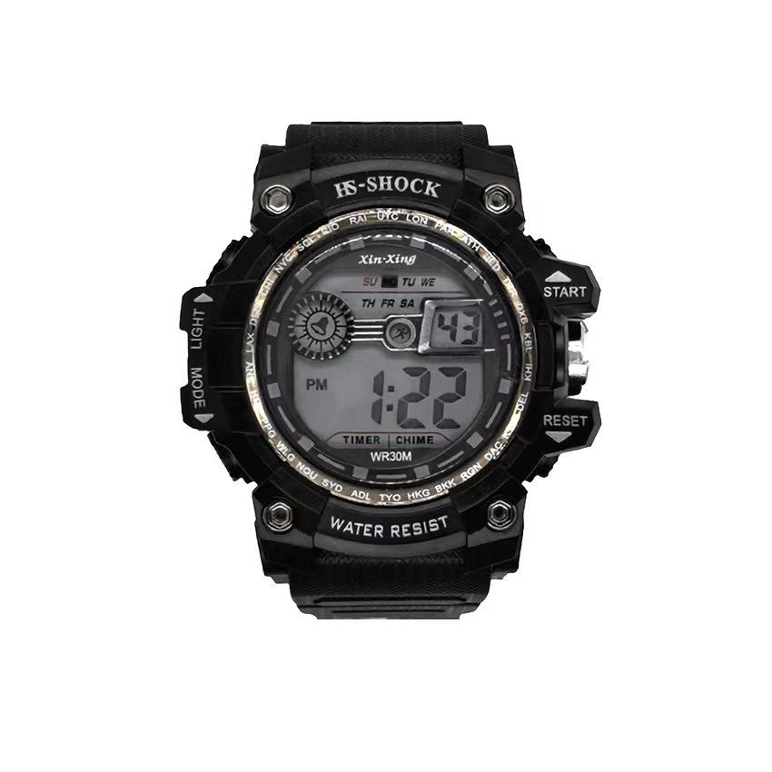 นาฬิกาควอทซ์สปอร์ตสำหรับผู้ชายสีดำ LED พร้อมสายหนังหน้าปัดกระจก HS-SHOCK ธุรกิจกันน้ำ