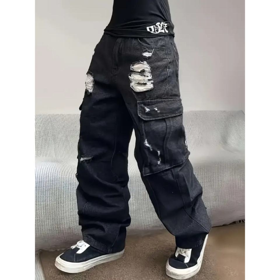 กางเกงยีนส์ผู้ชายสไตล์อเมริกัน ทรงหลวม ขากว้าง เอวกลาง ผ้าเดนิมสีเข้ม ขาดเซอร์ๆ แบบวินเทจ สำหรับฤดูหนาว