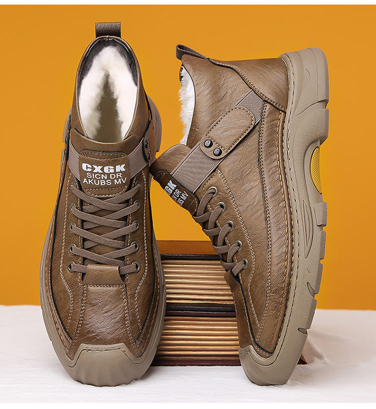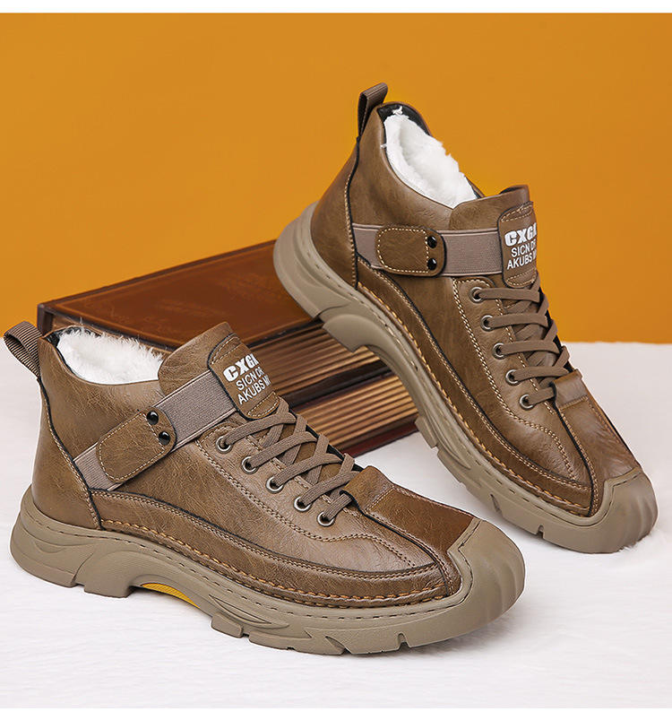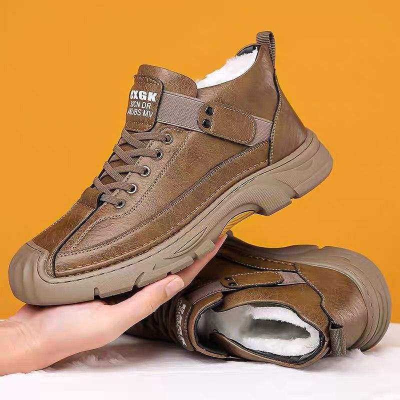 รองเท้าบูทปีนเขาสำหรับผู้ชาย ฤดูใบไม้ร่วง-ฤดูหนาว บุหนา กันหนาว หนังแท้ หุ้มข้อกลาง หน้าผ้าตาข่าย กันน้ำ กันลื่น สวมใส่สบาย