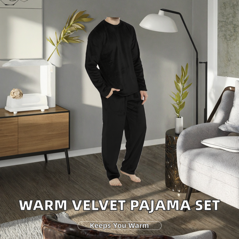 ชุดนอนผู้ชายผ้าคอรัลเวลัวร์หนานุ่ม 220 กรัม สำหรับฤดูใบไม้ร่วงและฤดูหนาว สีพื้น ชุด 1 ชิ้น เสื้อแขนยาวแบบสวม กางเกงขายาว