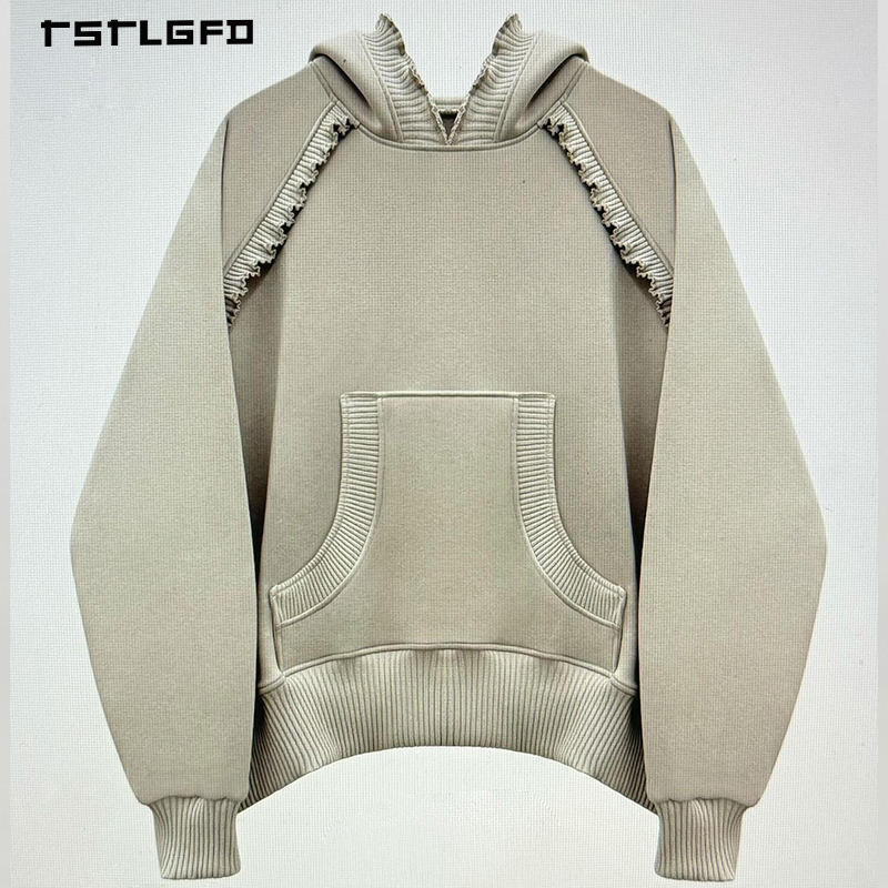 ชุดฮู้ดดี้สไตล์ Avant-Garde สำหรับผู้ชาย แบบ Deconstructed ผ้าฟลีซหนานุ่ม ใส่สบาย เหมาะกับฤดูใบไม้ผลิ เป็นมิตรต่อสิ่งแวดล้อม ตกแต่งด้วยผ้าปะติดแบบ 3 มิติ