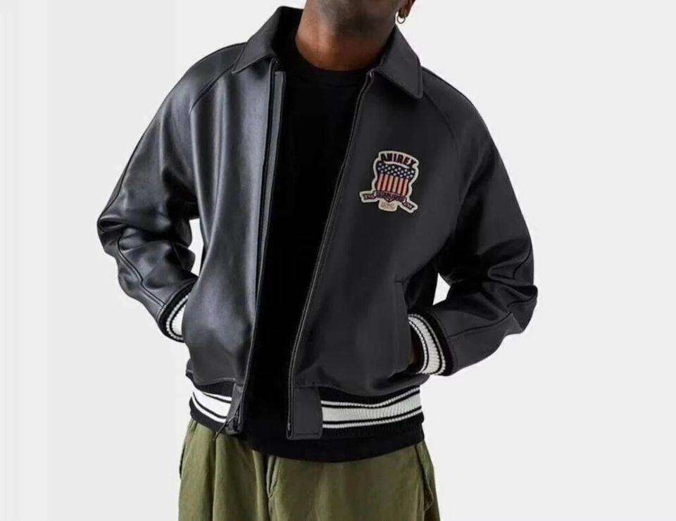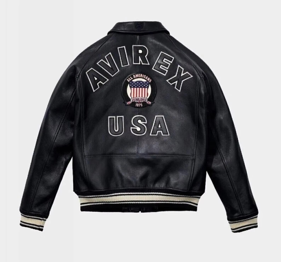 เสื้อแจ็คเก็ตวาร์ซิตี้ Avirex USA Edition Icon สำหรับผู้ชาย หนังแกะแท้ กันลม ซับในผ้าไหมสำหรับฤดูหนาว สีดำ