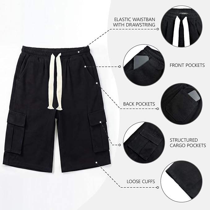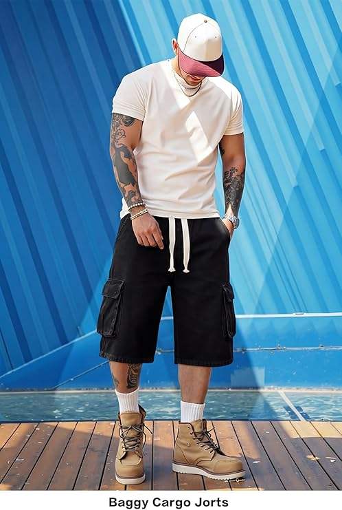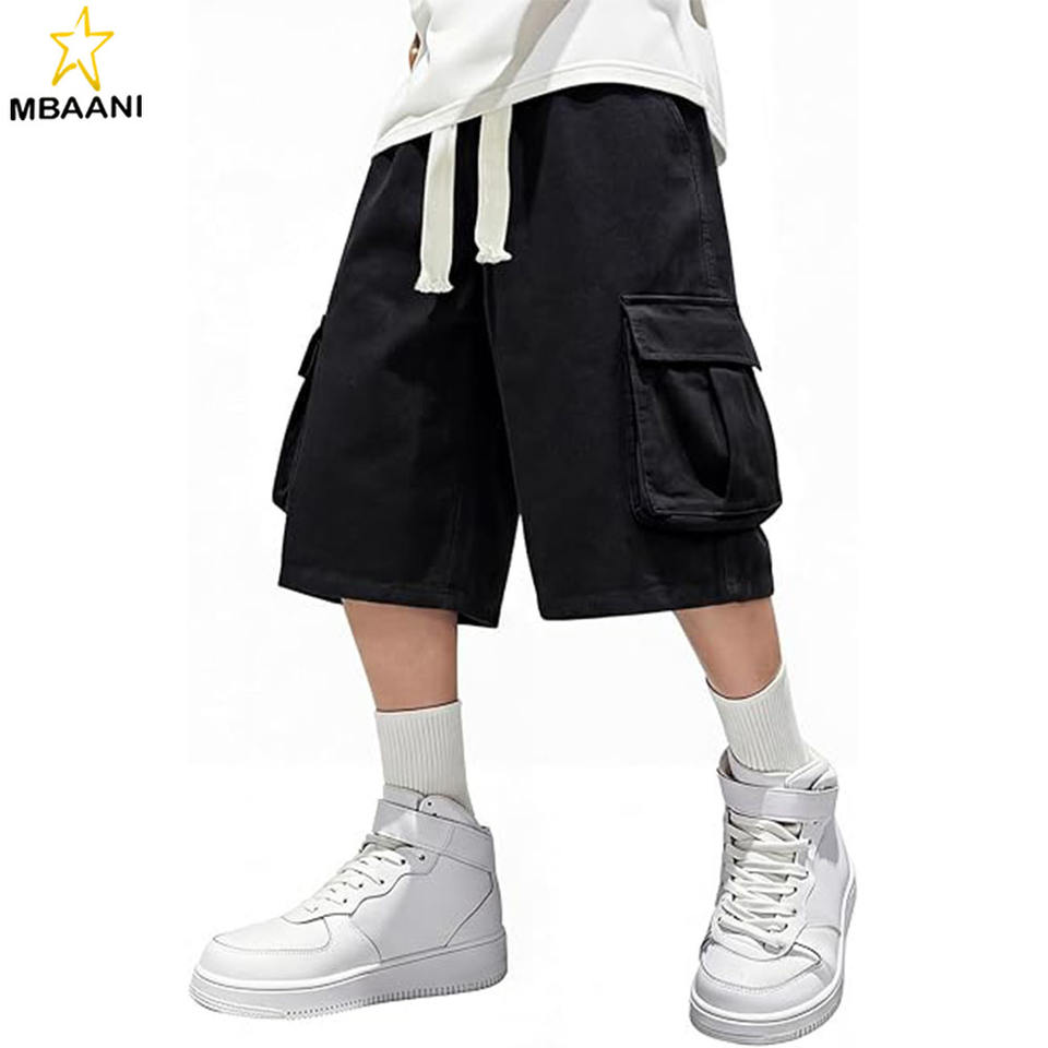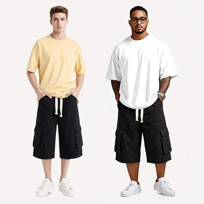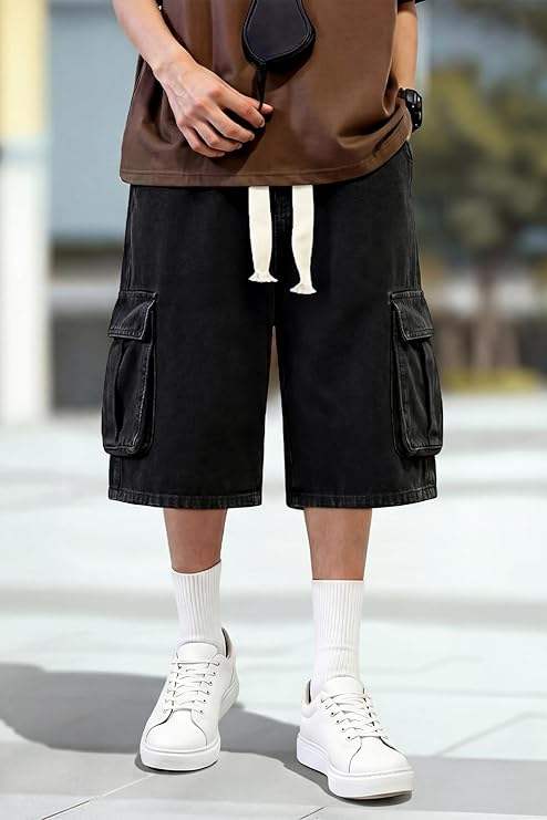 กางเกงยีนส์ขาสั้นทรงหลวมสำหรับผู้ชาย กางเกงยีนส์เดนิมขายาวแบบคาร์โก้ เอวยางยืด ความยาวขาใน 15 นิ้ว