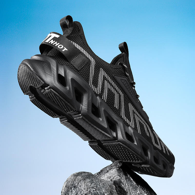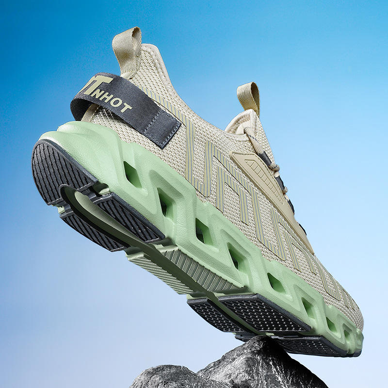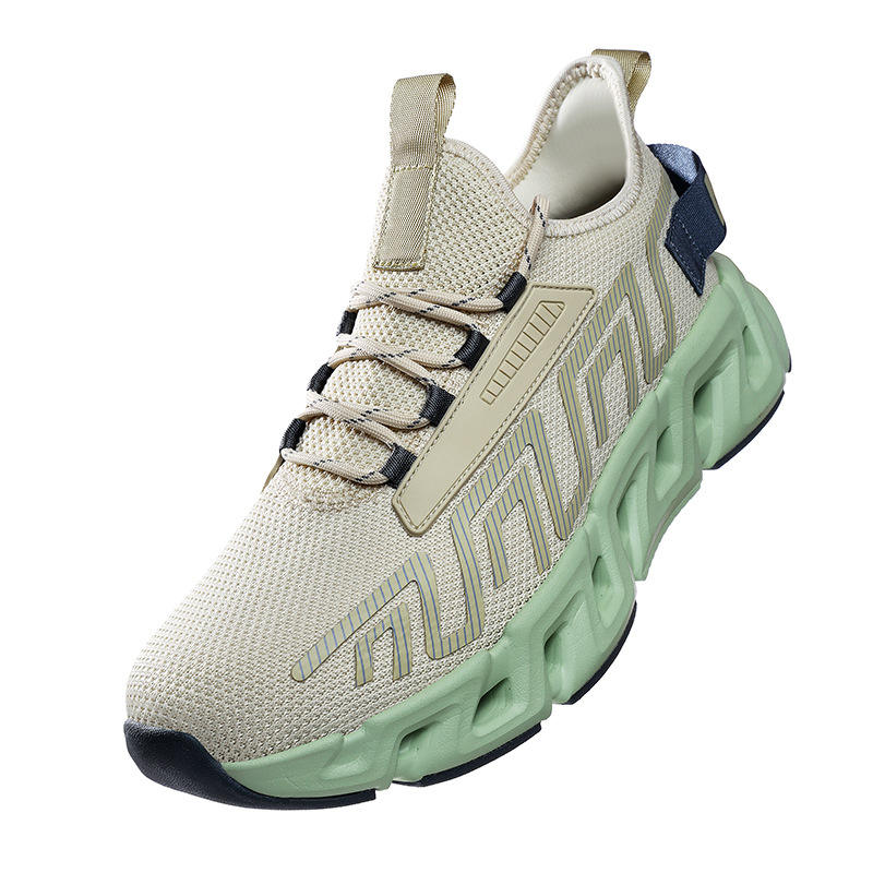รองเท้าวิ่งผู้ชายสีเบจกรีนเบลดโซล ระบายอากาศได้ดี พื้นรองเท้าแบบเบลดกันลื่น รองเท้าผ้าใบกีฬา