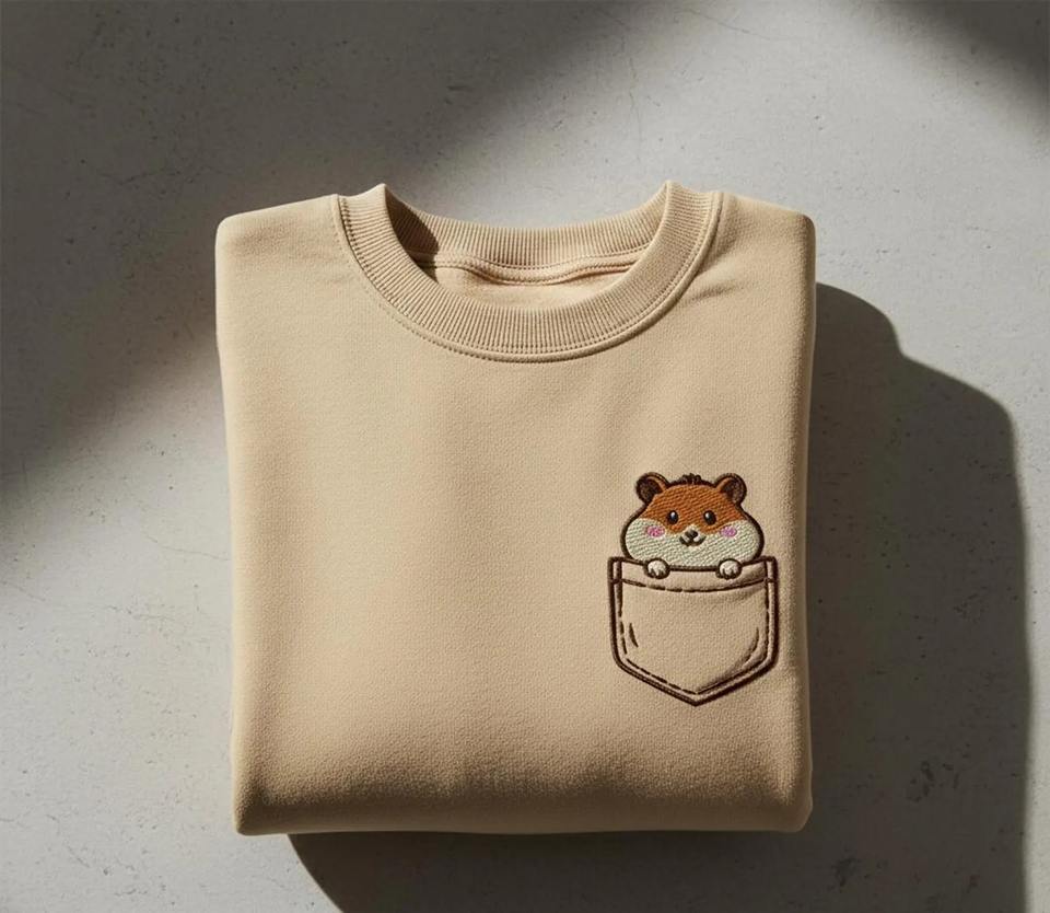 เสื้อสเวตเชิ้ตปักลายหนูแฮมสเตอร์สีเบจสำหรับผู้ชาย ดีไซน์กระเป๋าสัตว์น่ารัก เสื้อคอกลมผ้าฝ้ายลำลองสำหรับสวมใส่ทุกวัน