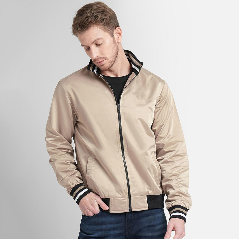 แจ็กเก็ตบอมเบอร์ผ้าซาตินสีเบจของผู้ชายเสื้อแจ็กเก็ตแนวแฟชั่นลำลองมีแถบสีขาวดำ