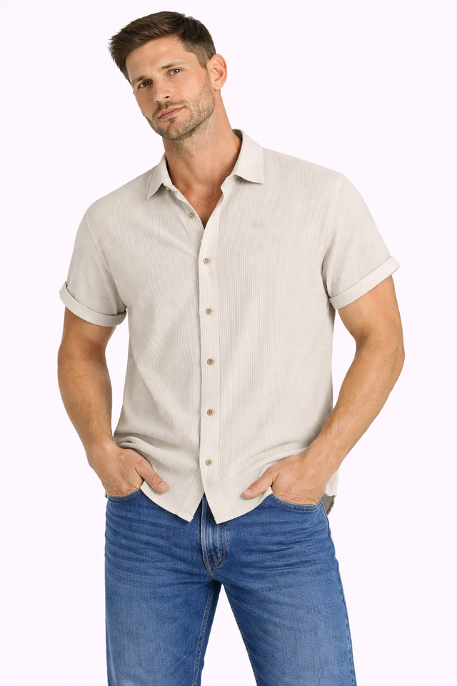 เสื้อเชิ้ตผู้ชายแขนสั้นสีเบจเนื้อผ้ามีเท็กซ์เจอร์ ปกคลาสสิก สวมใส่สบายในฤดูร้อน พร้อมปลายแขนพับได้ น้ำหนักเบา ระบายอากาศได้ดี