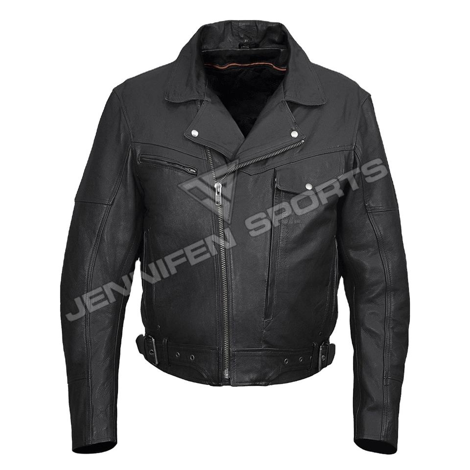 เสื้อแจ็คเก็ตรถจักรยานยนต์ผู้ชายหนังวัวแท้หนังเรียบหน้าหน้าอกและกระเป๋าด้านข้างซิปปิดภายในซับใน
