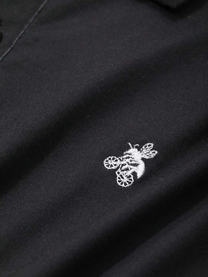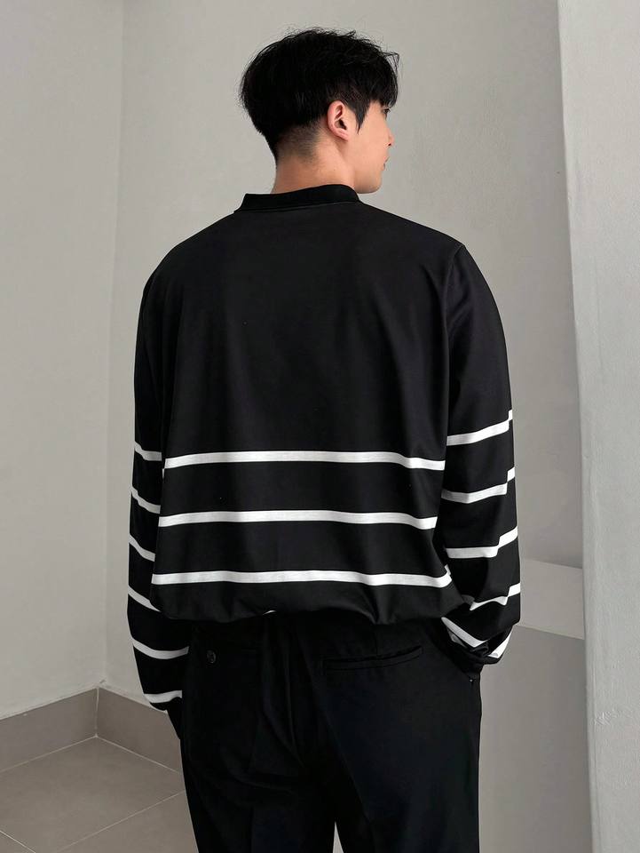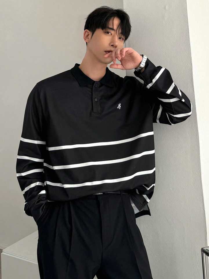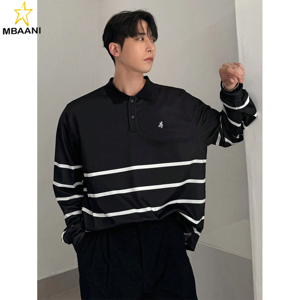 เสื้อเชิ้ตโปโลแขนยาวลายทางสีดำและสีขาวสำหรับผู้ชาย เสื้อผ้าฤดูใบไม้ร่วง