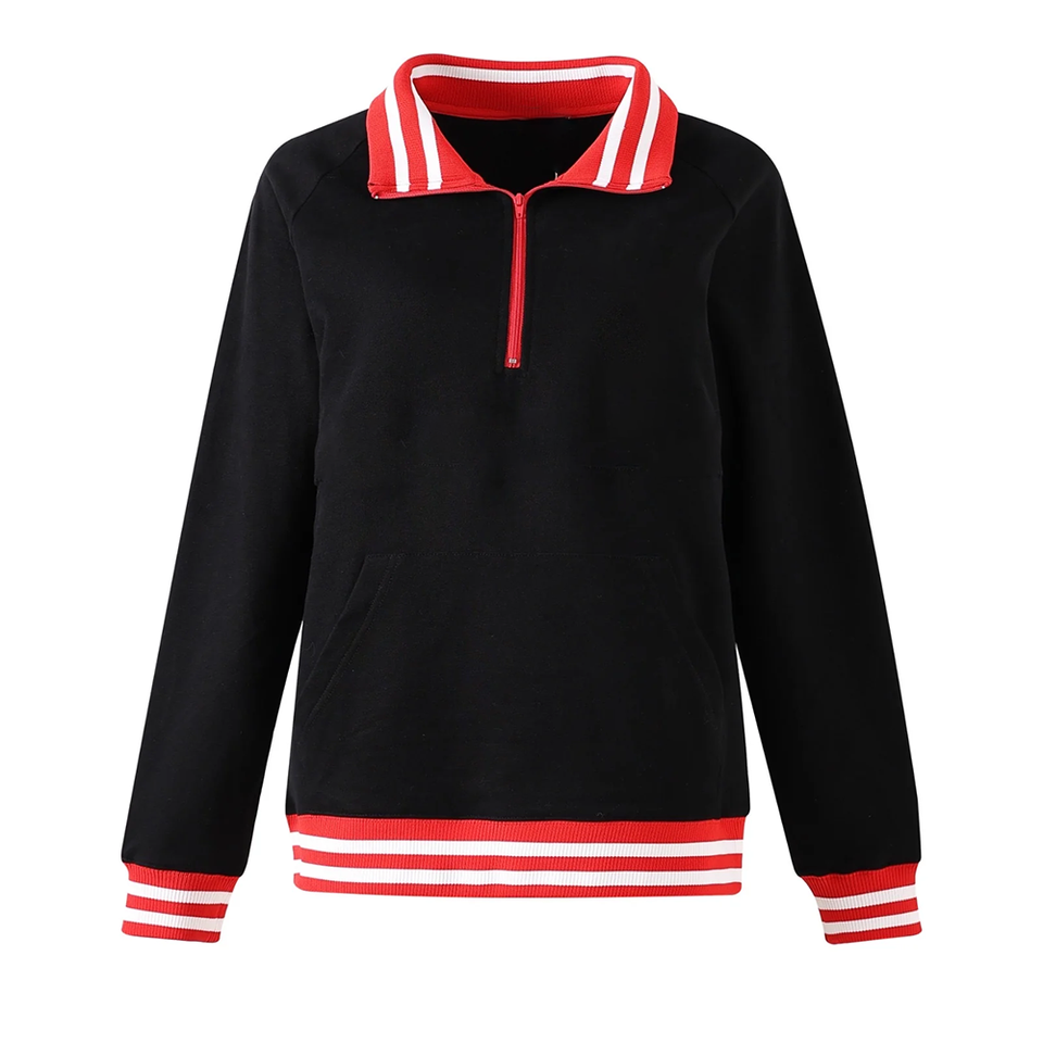 เสื้อสเวตเตอร์โปโลมีซิปสำหรับผู้ชายสีดำลายขวางมีกระดุมข้อมือเสื้อโปโลสีแดงปักลายสำหรับฤดูหนาวสไตล์ลำลอง