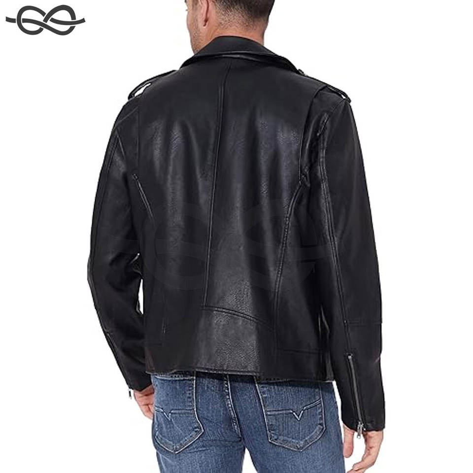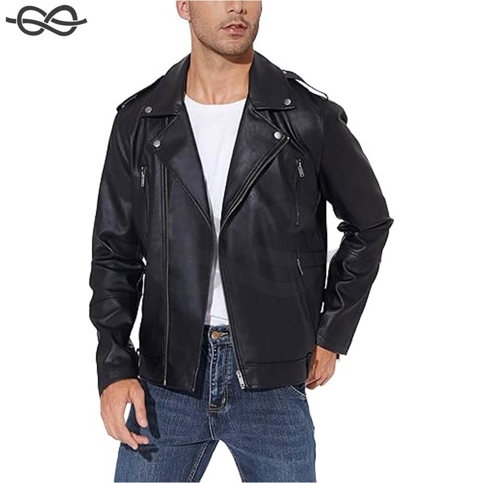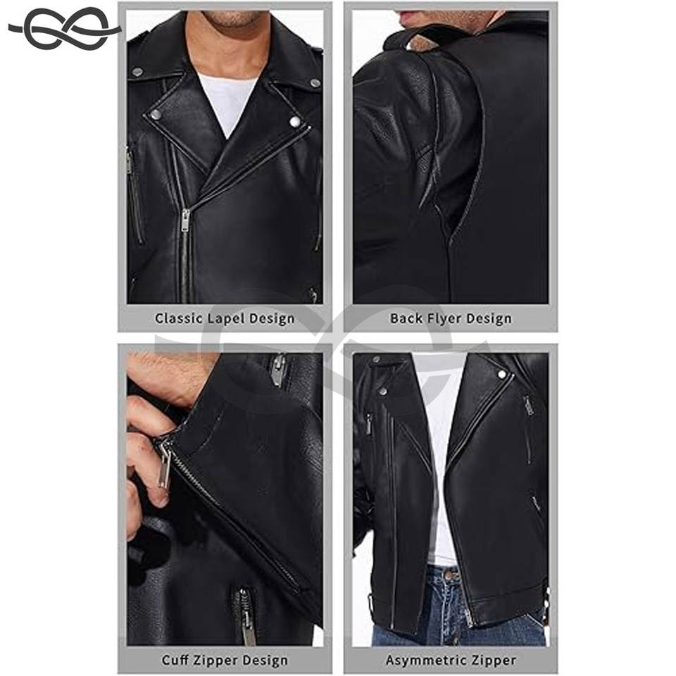แจ็กเก็ตหนังเทียมสีดำสำหรับผู้ชายเสื้อโค้ทไบเกอร์เข้ารูปคอตั้งสไตล์เรียบง่ายมีซิปรูด