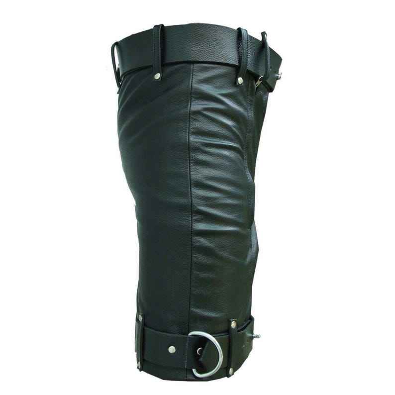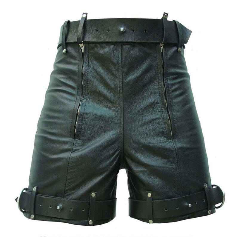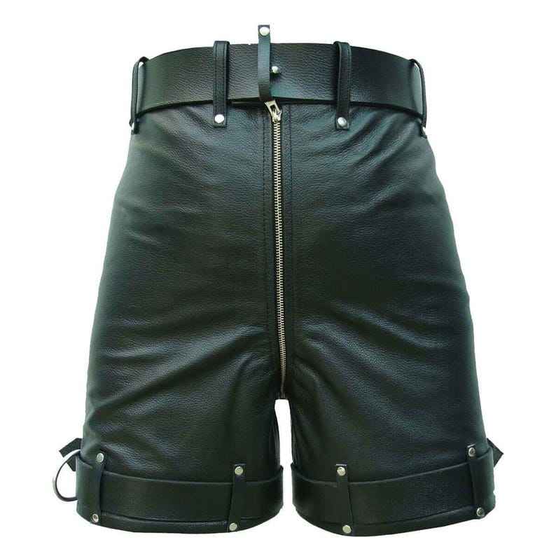 Men's Black Leather Chastity Bondage Shorts – Rear Zip Locking Belted BDSM Gear