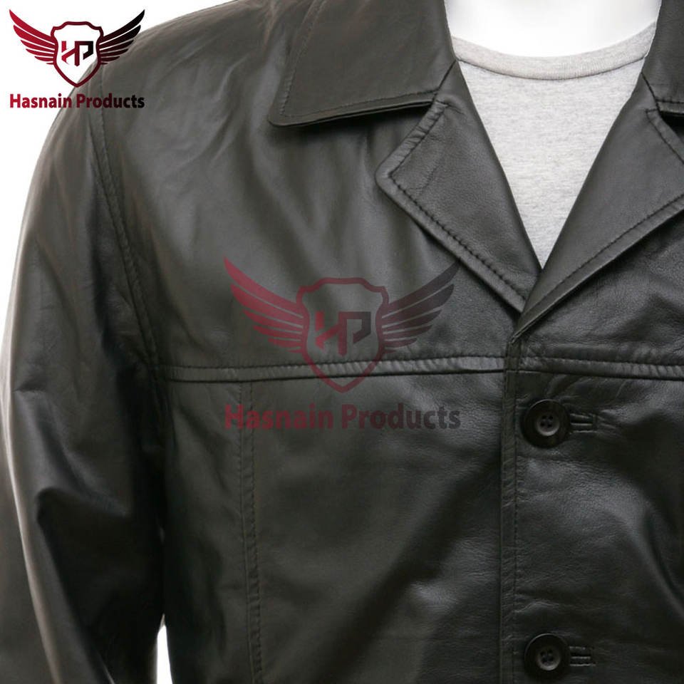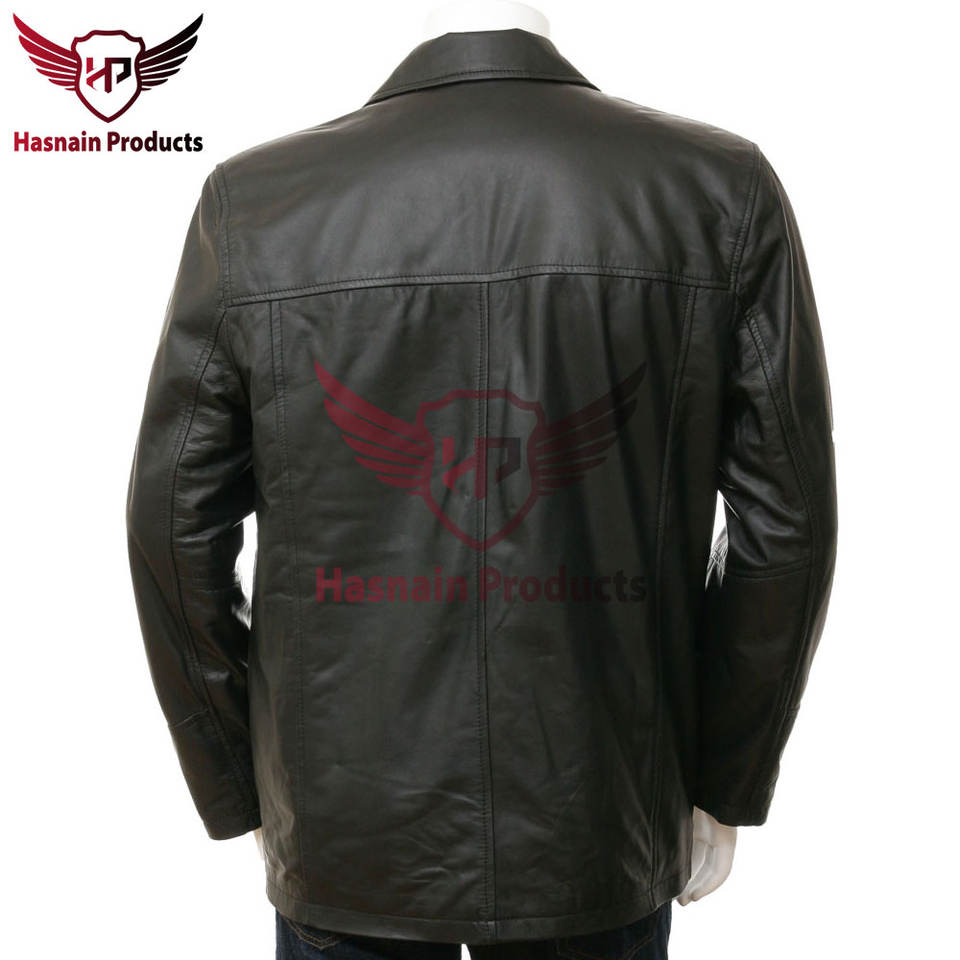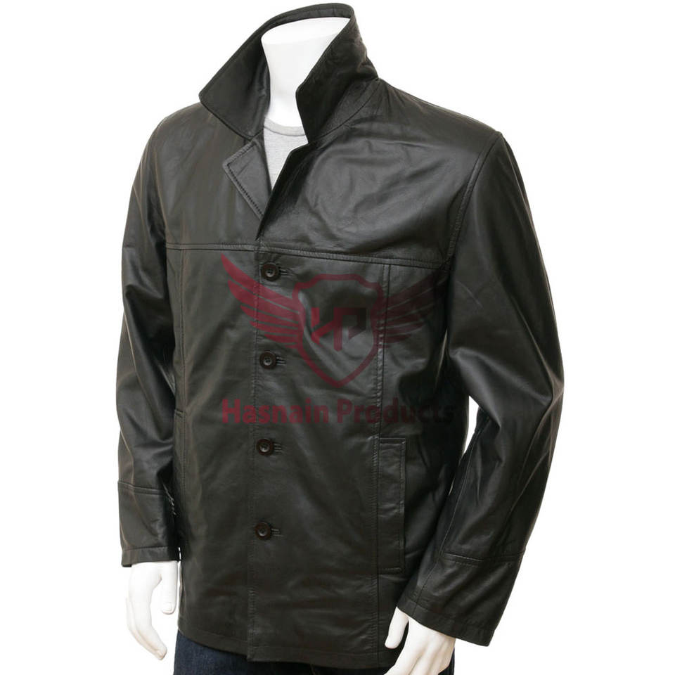 เสื้อแจ็คเก็ตรีฟเฟอร์หนังสีดําสําหรับผู้ชาย - สไตล์คลาสสิกพร้อมปุ่มด้านหน้า, กระเป๋าสะโพกแทรก, และด้านหลังธรรมดา - พอดีมาตรฐานสําหรับฤดูหนาว
