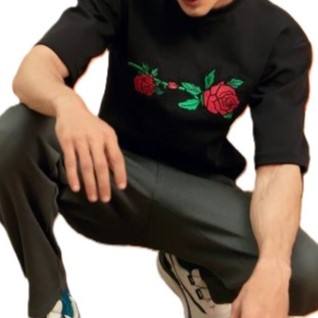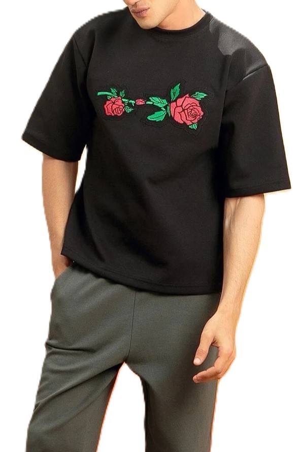 เสื้อยืดปักลายดอกกุหลาบสีดำสำหรับผู้ชาย – เสื้อยืดผ้าฝ้ายลายดอกไม้สุดเก๋ เสื้อคอกลมแขนสั้นลำลองสำหรับแฟชั่นสตรีทแวร์