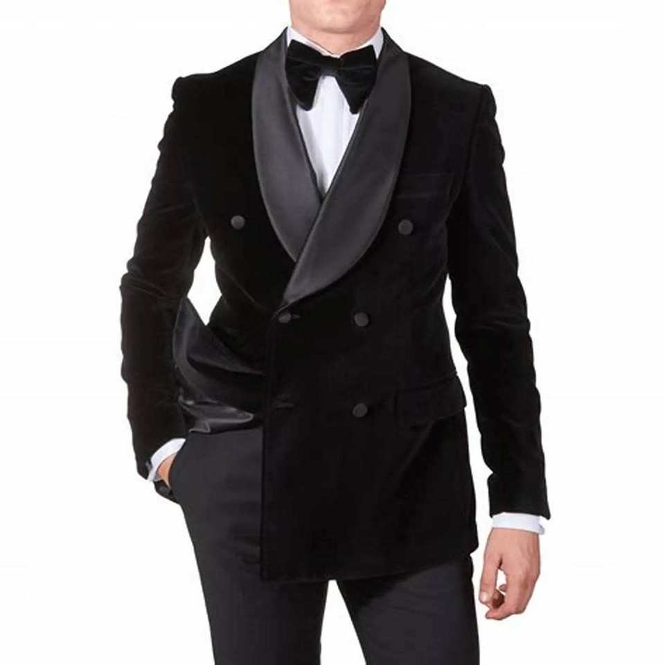 Men's Black Velvet 2-Piece Slim Fit Double Breasted Suit Business Wedding Party Tuxedos with Shawl Lapel Jacket Trousers Size XL