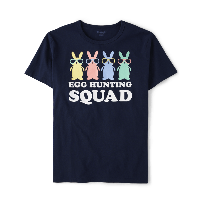 เสื้อยืดกราฟิกล่าสัตว์ไข่สีฟ้าของผู้ชายระบายอากาศได้และกันรอยยับปักโลโก้ทรงหลวมพอดีกับการออกนอกบ้านของครอบครัว