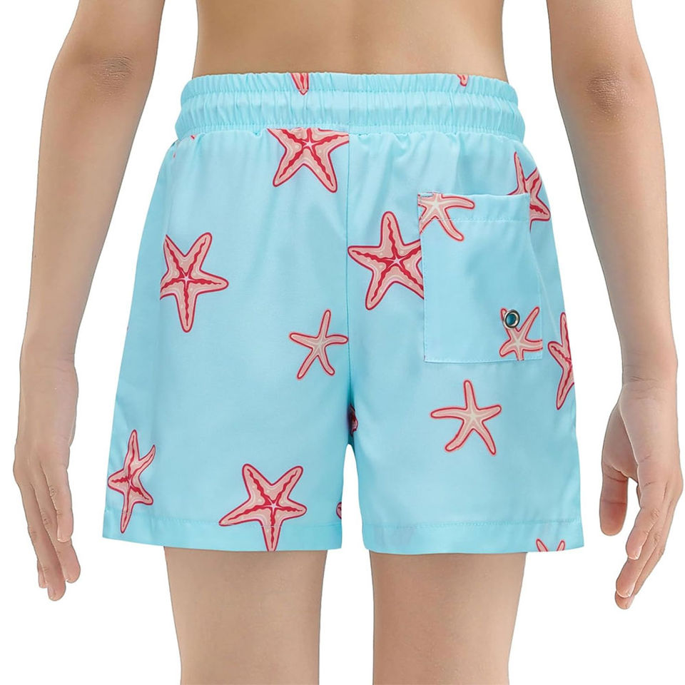 กางเกงว่ายน้ำพิมพ์ลายสีน้ำเงินสำหรับผู้ชายกางเกงเอวรูดกางเกงขาสั้นผ้าโพลีเอสเตอร์ดีไซน์สีทึบเป็นมิตรกับสิ่งแวดล้อม100% สีฟ้า