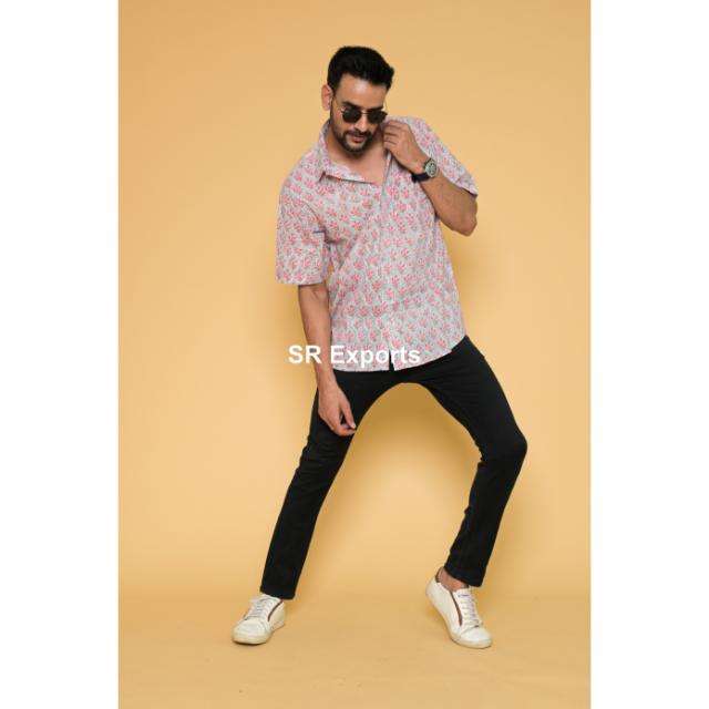 เสื้อเชิ๊ตผ้าฝ้ายโบโฮของผู้ชายทำมือแขนสั้นสไตล์พิมพ์ลายสไตล์อินเดียน้ำหนักเบาติดกระดุมเสื้อลำลอง