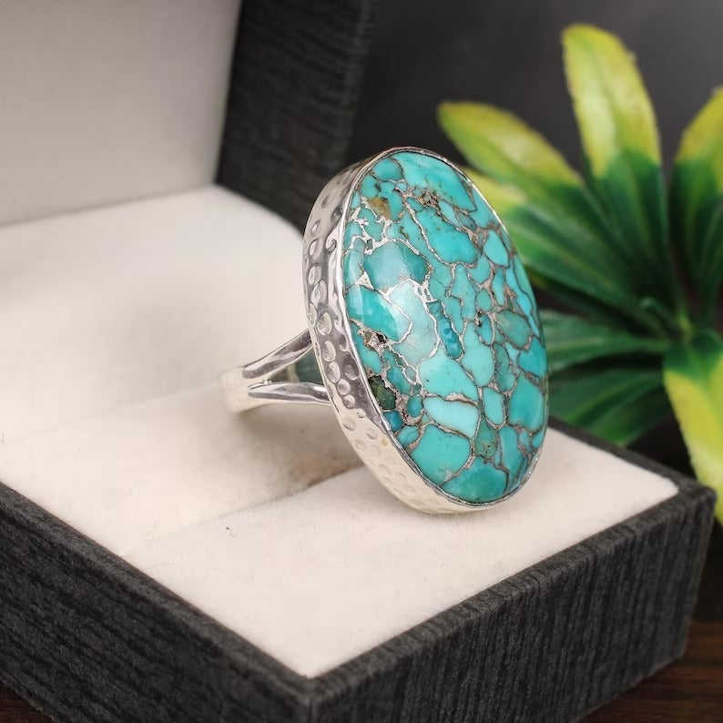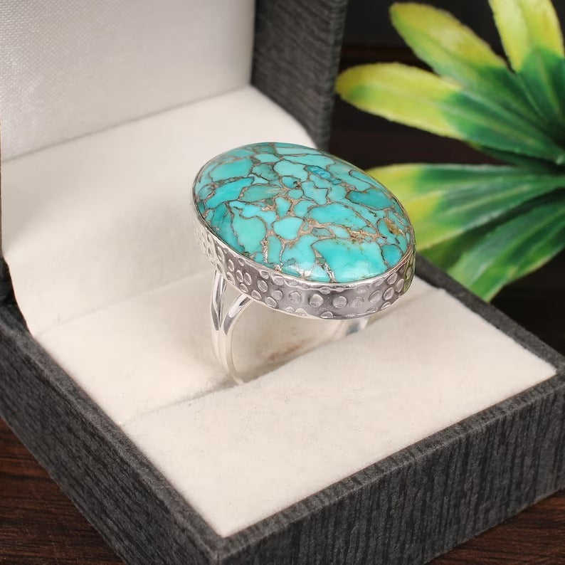 แหวนเงินสเตอร์ลิงอัญมณีเทอร์ควอยซ์ธรรมชาติสไตล์โบโฮสำหรับผู้ชาย14K ชุบโรเดียมสีเหลืองทอง34X23มม. ได้รับการรับรอง16.40g