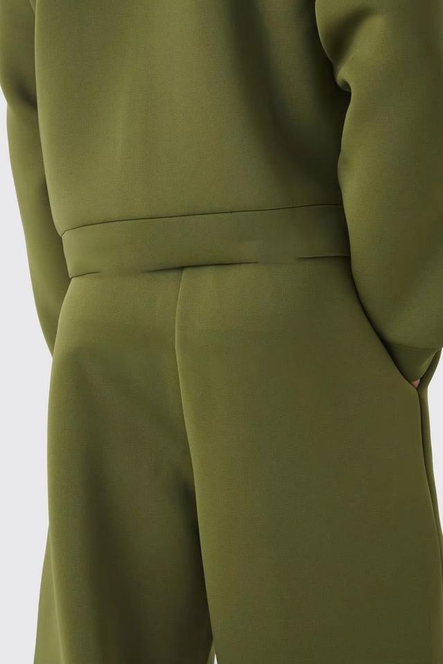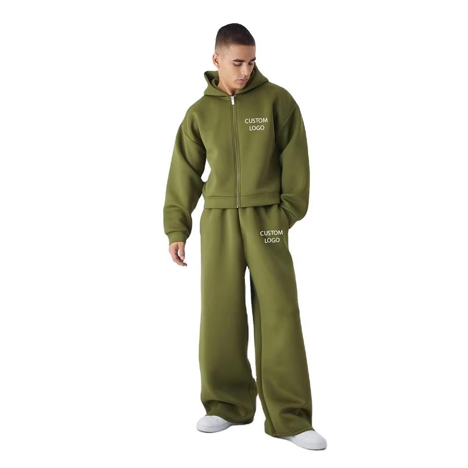 ชุดวอร์มมีฮู้ดเปิดไหล่โอเวอร์ไซส์ของผู้ชายกางเกงวอร์มขากว้างสีกากีชุดเสื้อผ้าแนวสตรีทแวร์ผ้า