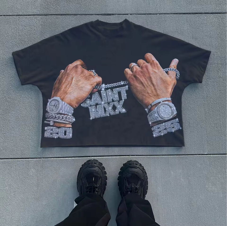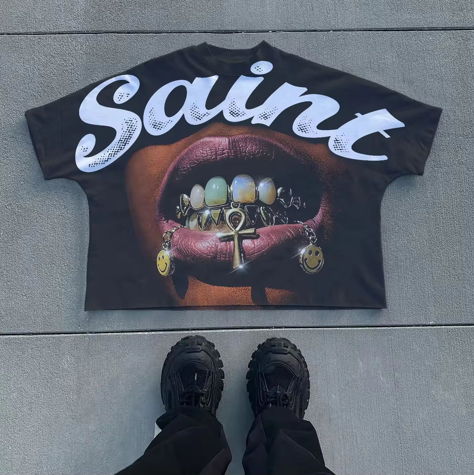 เสื้อยืดโอเวอร์ไซส์ทรงครอปสไตล์วินเทจสำหรับผู้ชาย พิมพ์ลายสกรีนโลโก้ตามสั่ง ผ้าผสมไหม/ฝ้าย 220 กรัม ลายพิมพ์สัตว์