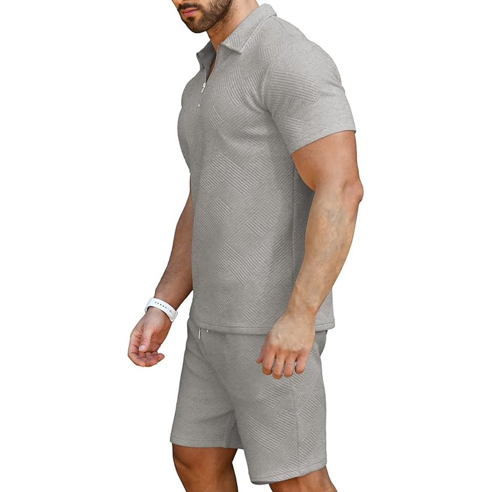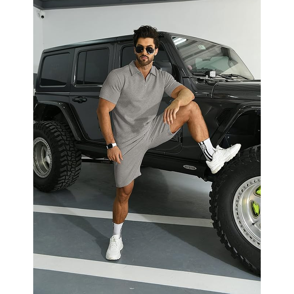 ชุดลำลองฤดูหนาวสำหรับผู้ชาย เสื้อโปโลแขนสั้นผ้าฝ้ายถัก ระบายอากาศได้ดี พร้อมกางเกงขาสั้น ลายพิมพ์ปัก